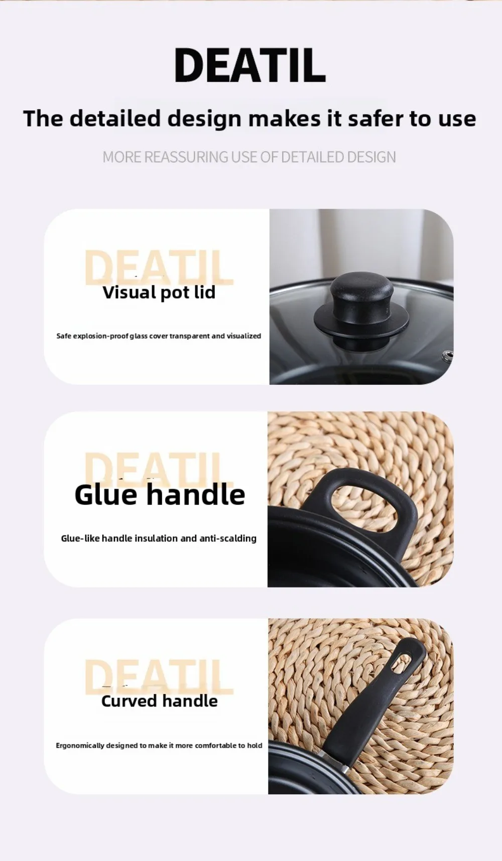 4. **Ergonomic and Anti scalding Handles**: Each pan is equipped with an ergonomic handle that provides a comfortable and secure grip. The handles are also anti scalding, ensuring safe handling while cooking and transferring food from the stove to the table.