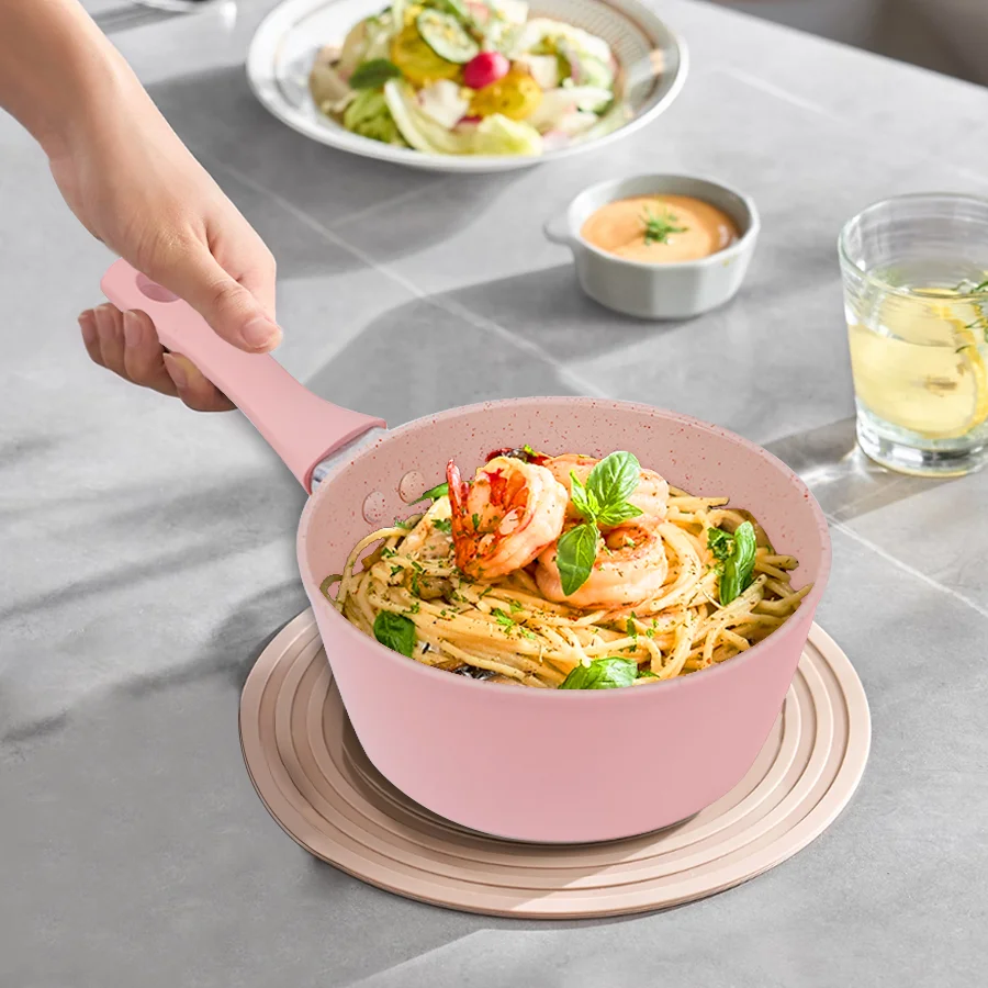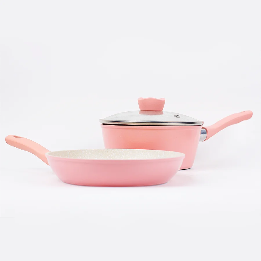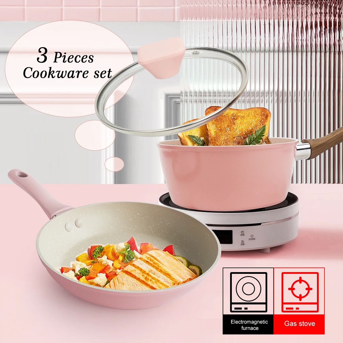 3Pcs Non-stick Cookware Set, Frying Pan and Stock Pot Set with Lid, Cute Home Kitchen Cooking Pots Set,Pink