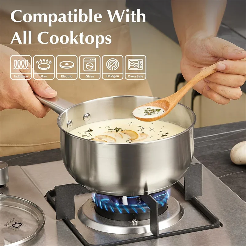 • Even Heat Distribution: The trip-ply bottom design of stainless steel saucepan ensures even heat distribution throughout the saucepan, promoting consistent cooking results and eliminating hot spots for delicious, perfectly cooked meals every time.