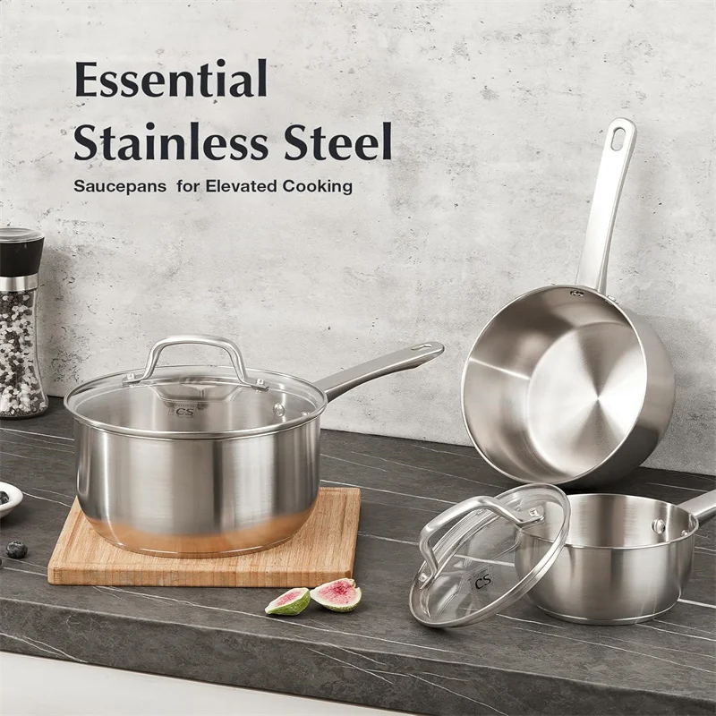 • Stainless Steel Saucepan Set of 3: This saucepan set comes in three sizes - 1 quart, 2 quarts, and 3 quarts. Whether you're heating milk for coffee, simmering sauces for pasta, or cooking larger batches of soups and stews, these saucepans are essential for versatile culinary tasks.